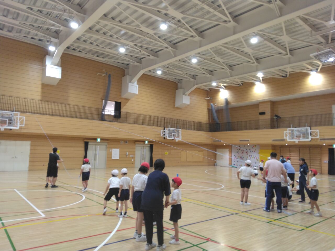 こうや学級が体育館で体育をしました。ギャラリーからひもを垂らしてそこにリレー用のバトンを通します。通したバトンをどこまで投げ上げられるかを競いました。