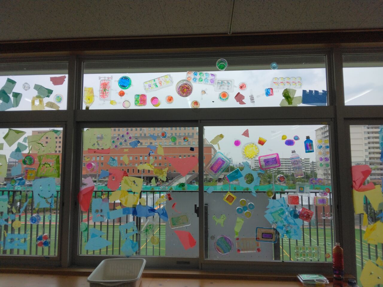 2年生が図工でひかりのプレゼントという単元で薄い色シートをガラスに貼って様々な色のコントラストを表現しました!