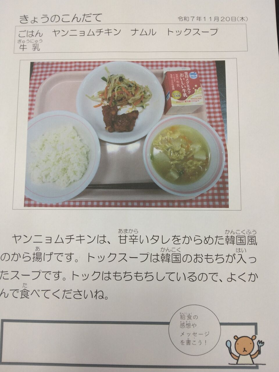 今日の給食は韓国料理の代表とも言えるナムル、ヤンニョムチキンです!