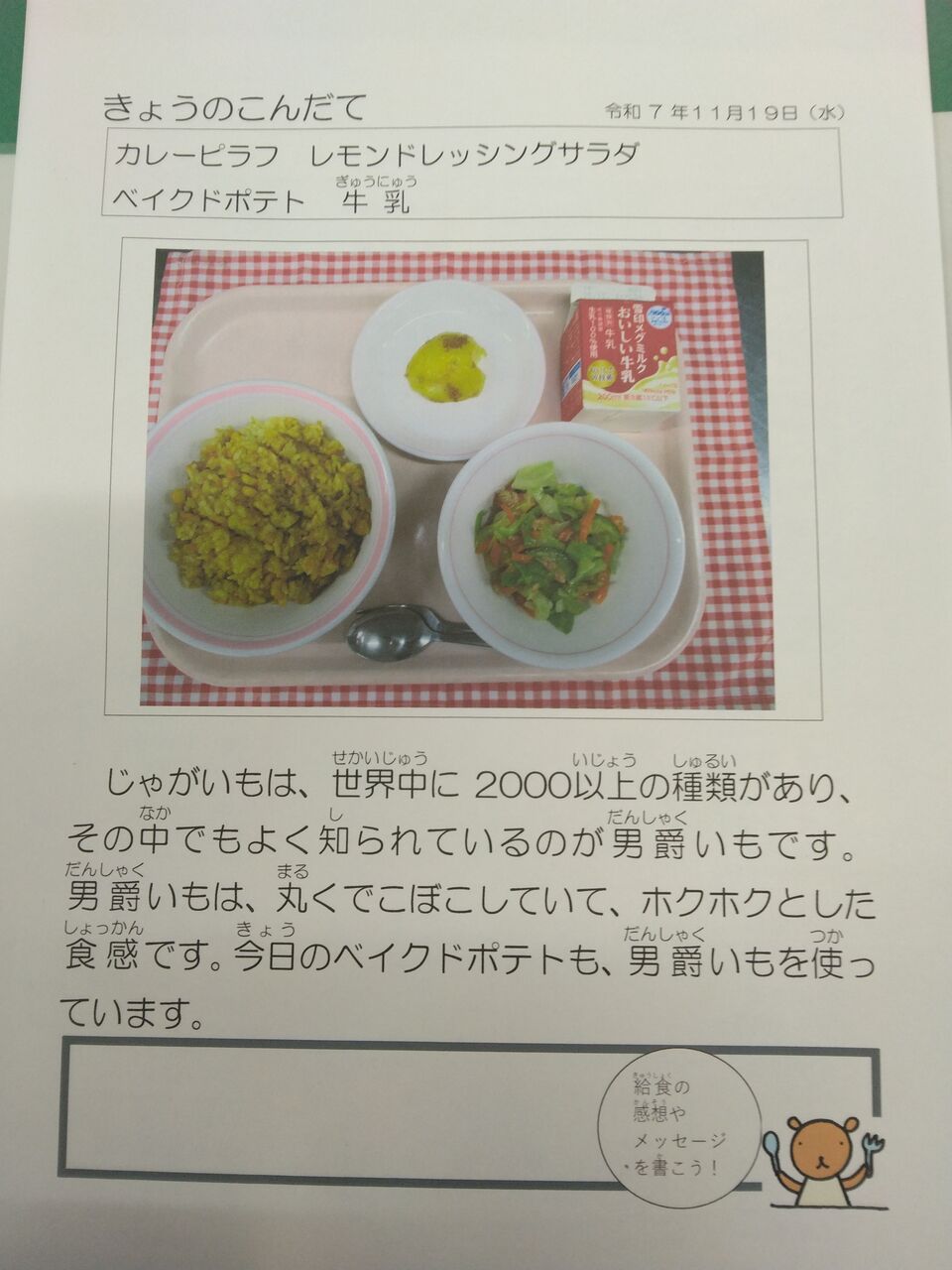 今日はカレーピラフでした。とても美味しくいただきました。