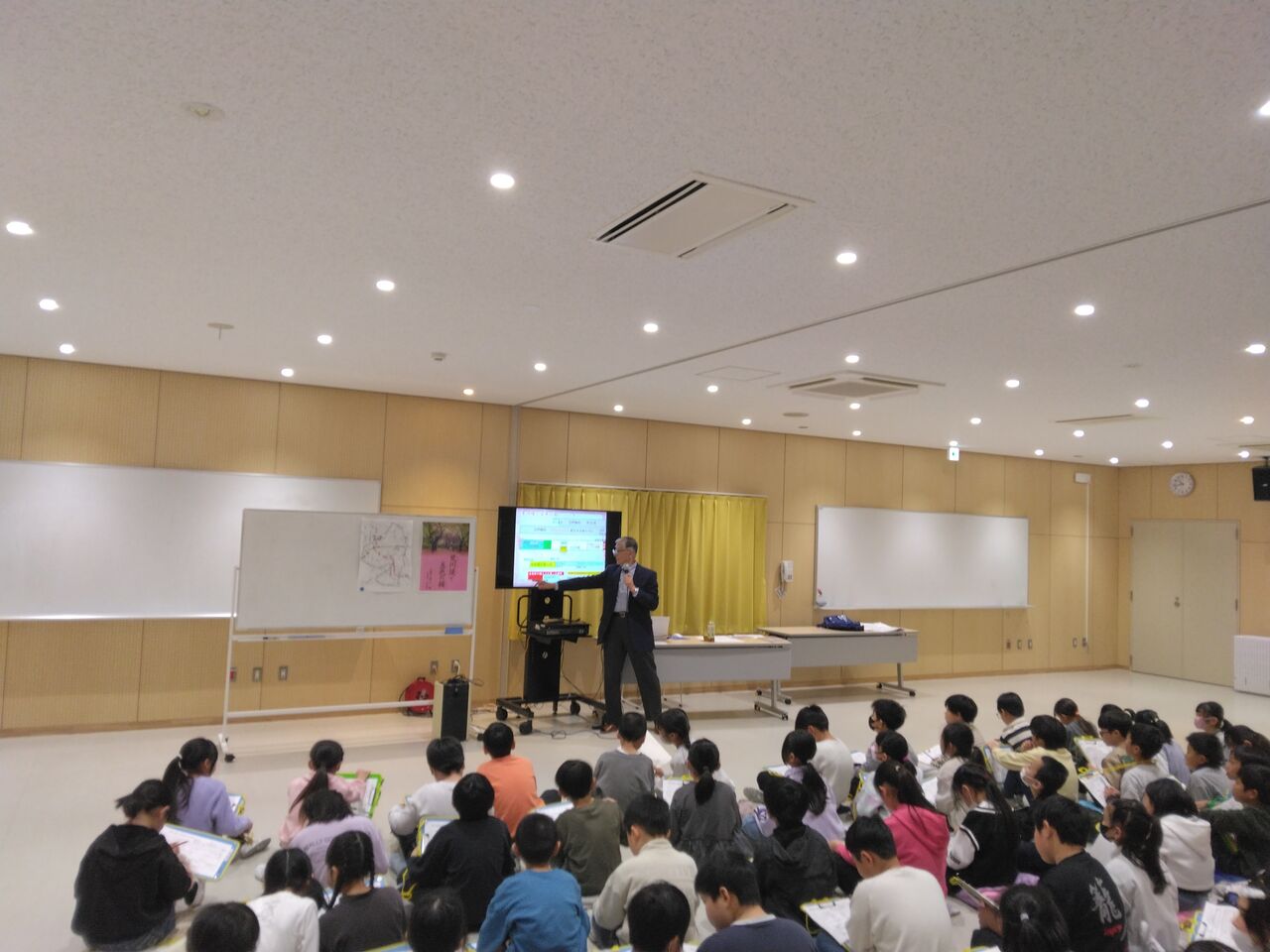 3年生が元江北小学校の教員で、元西新井第一小学校の校長だった矢萩先生をお迎えして江北地区の昔の話をお聞きしました。どの子供もしっかり聞いてメモを取りました。矢萩先生からは以前荒川堤と五色の桜という本をたくさん寄贈していただきました。