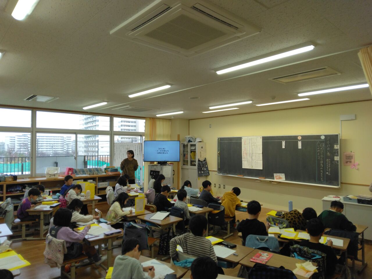 2年生が国語で物語文の スーホーの白い馬 を学習しています。場面ごとに主人公のスーホーの気持ちを読み取ります。みんな厳命に先生の授業を受けていました。